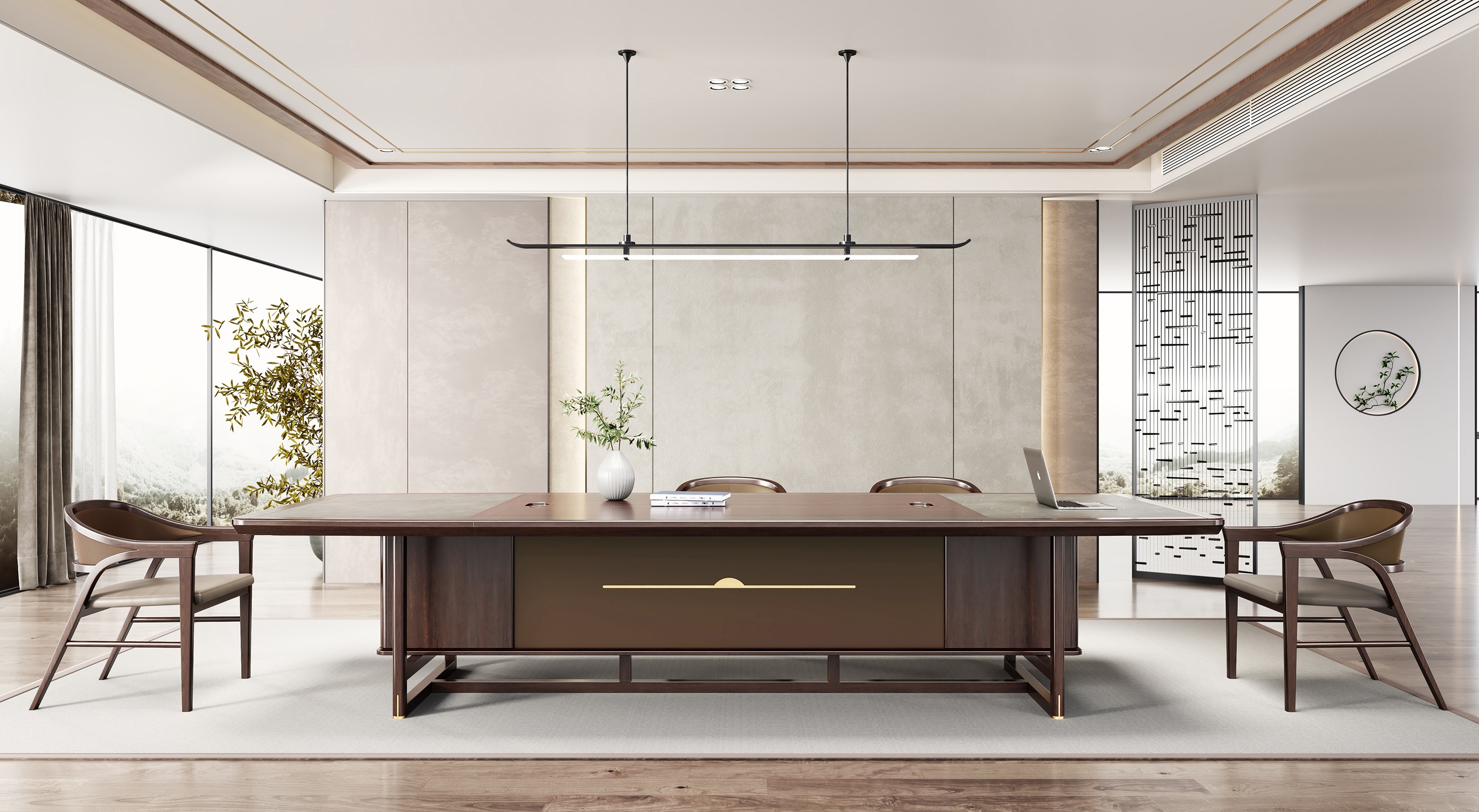 鸿泰系列是一款新中式风格的总裁办公产品,设计灵感源于中式传统装饰纹样“回”字形,因其形式回环反复,延绵不断,有吉利长久的吉祥寓意在造型上主要采用硬朗简洁的直线条,温洞的乌金木与质朴的岩板相结合刚柔并济,时尚大方,既有中式家具古典质朴的内涵显现